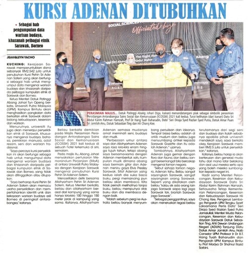 Perasmian Kursi Pehin Sri Adenan Satem telah disempurnakan oleh Yang Berbahagia Datuk Patinggi (Dr) Abang Haji Abdul Rahman Zohari bin Tun Abang Haji Openg, Premier Sarawak pada 27 Oktober 2021 di Hotel Grand Magherita, Kuching bersempena dengan perasmian Konferen Antarabangsa Sains Sosial dan Kemanusiaan 2021(ICOSH 2021). |
